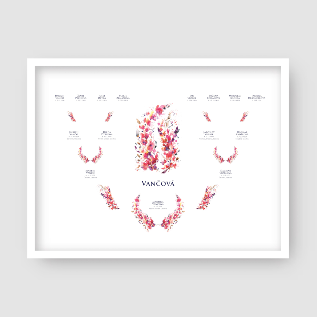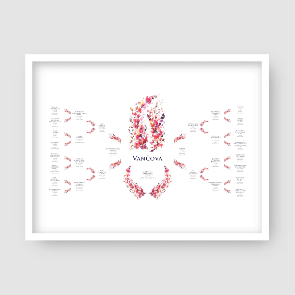 After purchasing a What the Heart Wants family tree, you will receive an email confirmation to a form so you can fill in your family names and important dates. We will use this information to design your family tree and then send you a digital proof to check and approve.